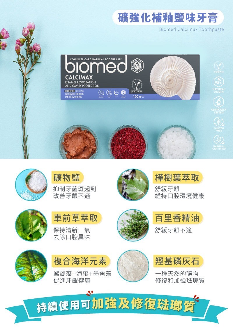結合礦物鹽及羥基磷灰石和天然藻類萃取的配方成分,天然礦物用於口腔有助於修復和強化琺瑯質,抑制牙菌斑的生成,同時舒緩牙齦不適。無論是強化牙齒質地,還是改善口腔不適,都帶來更舒適的口腔環境,為牙齒提供全方位的保護。