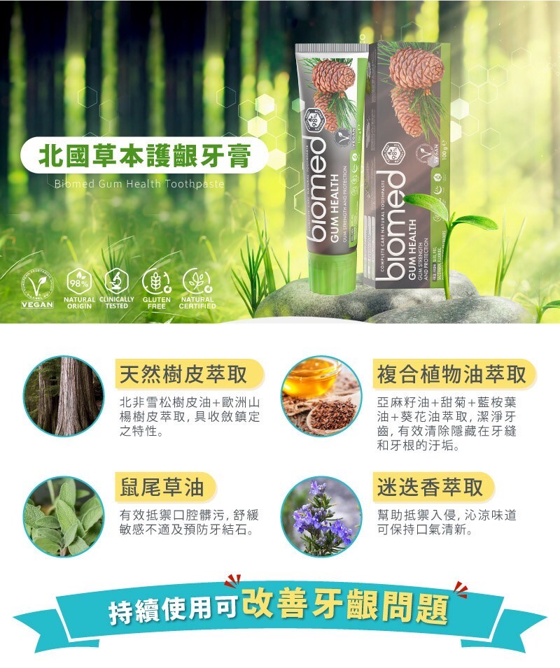 亞麻籽油、甜菊、藍桉葉油和葵花油的萃取則能徹底清除隱藏在牙縫和牙根的汙垢,最後是迷迭香萃取抵禦壞菌入侵,為口腔健康提供完美護理,打造全面護齦體驗。