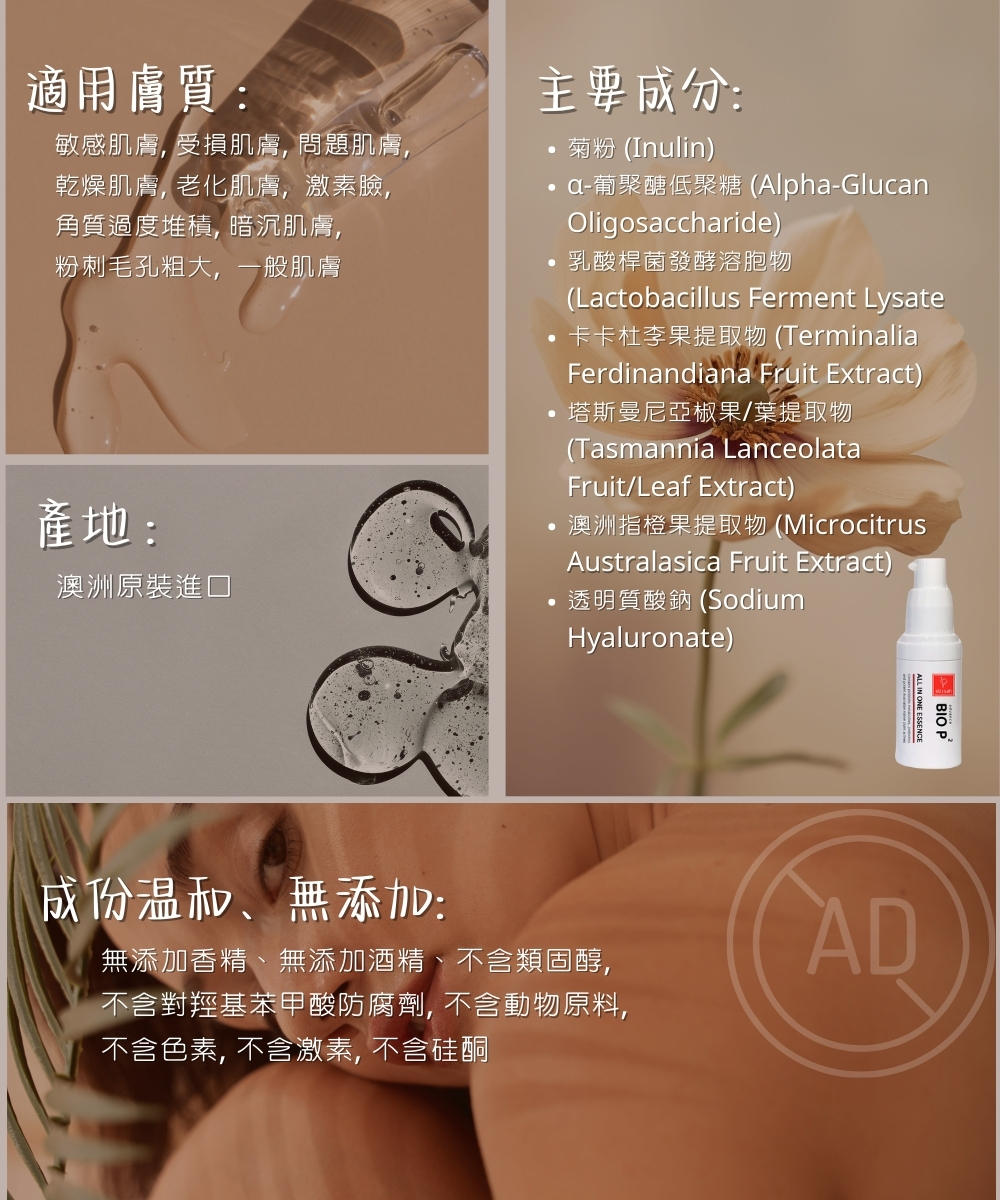 適用膚質 : 敏感肌, 受損肌, 問題肌, 乾燥肌, 老化肌, 激素臉, 角質堆積, 暗沉肌膚, 粉刺毛孔粗大