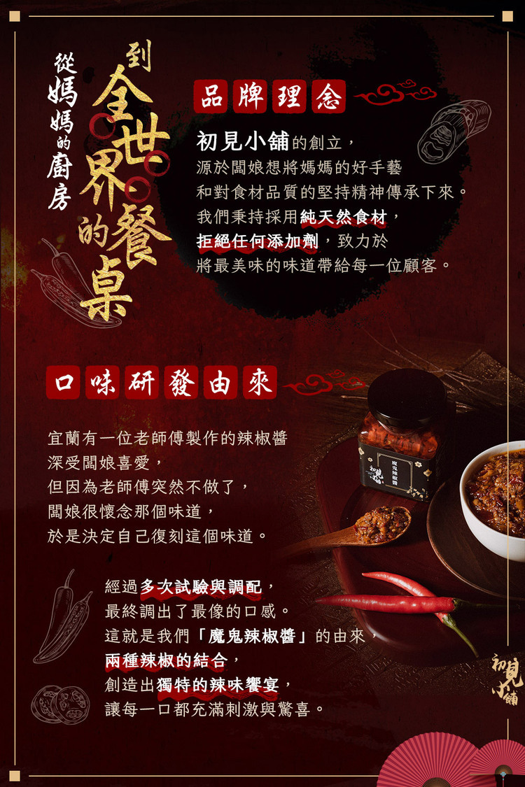 內容物:魔鬼椒、朝天椒、蒜頭、冰糖、辣椒粉、花椒粉、鹽、糖、大豆油
