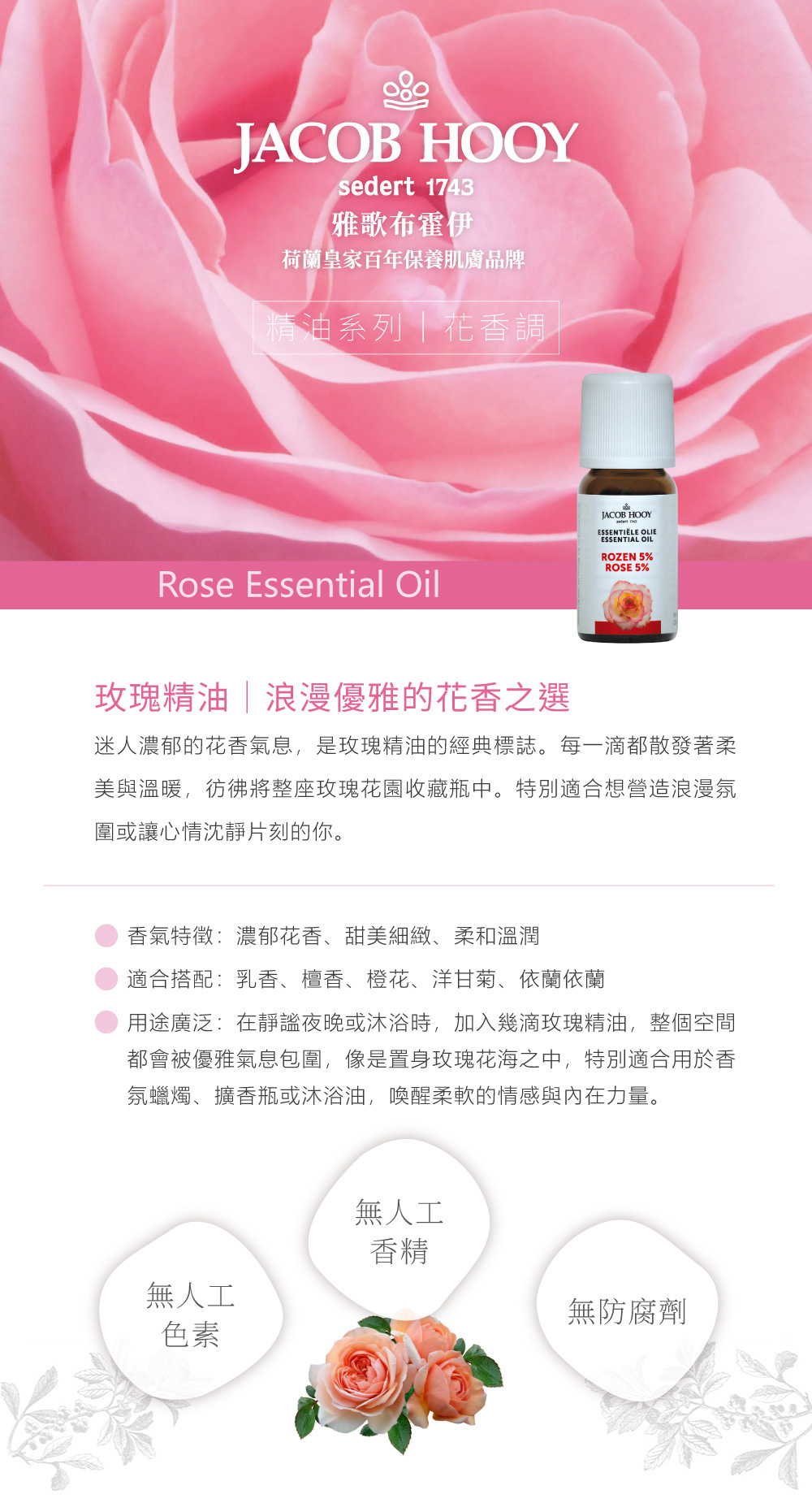 迷人濃郁的花香氣息,是玫瑰精油的經典標誌。每一滴都散發著柔美與溫暖,彷彿將整座玫瑰花園收藏瓶中。特別適合想營造浪漫氛圍或讓心情沈靜片刻的你。