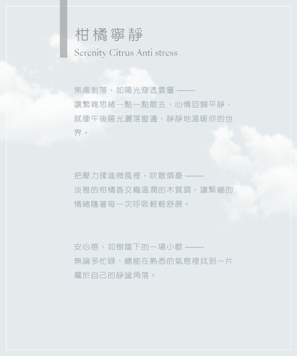 以清新溫暖的柑橘香氣,釋放日常壓力與焦慮。