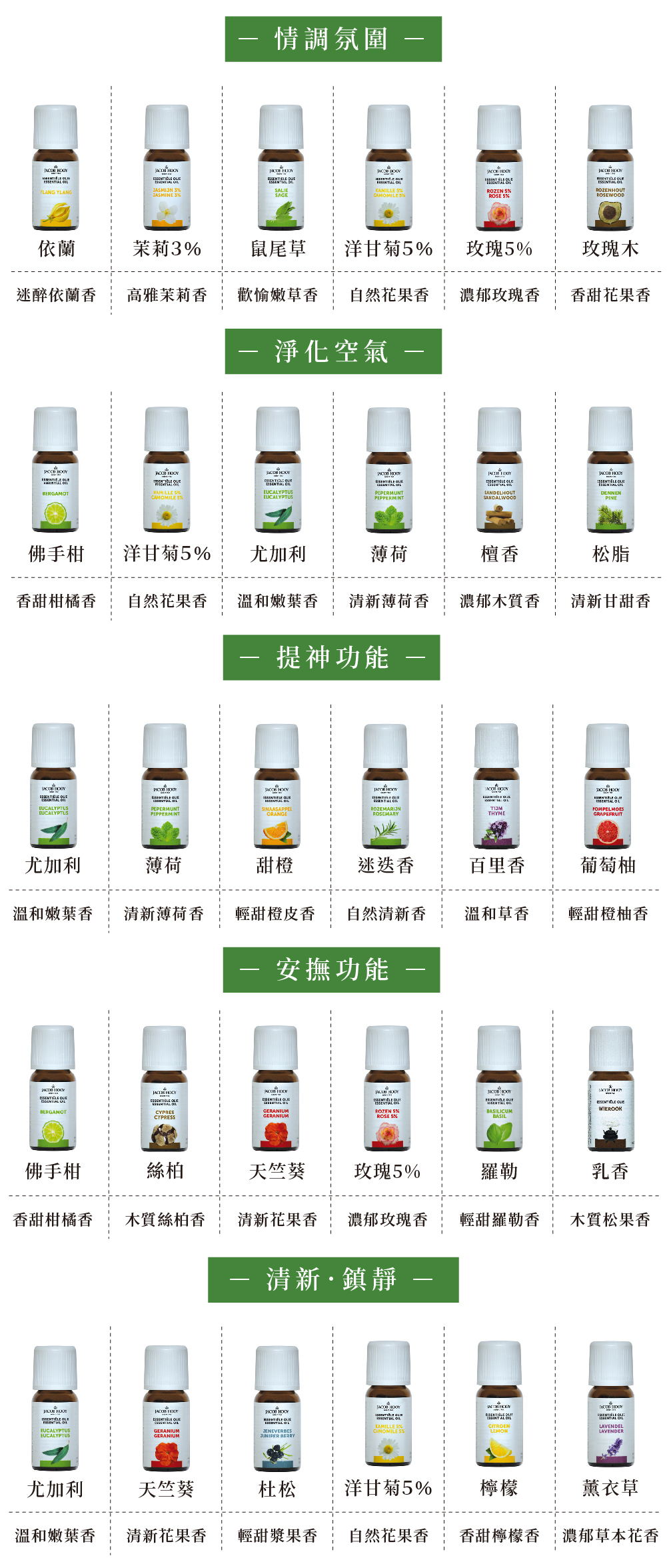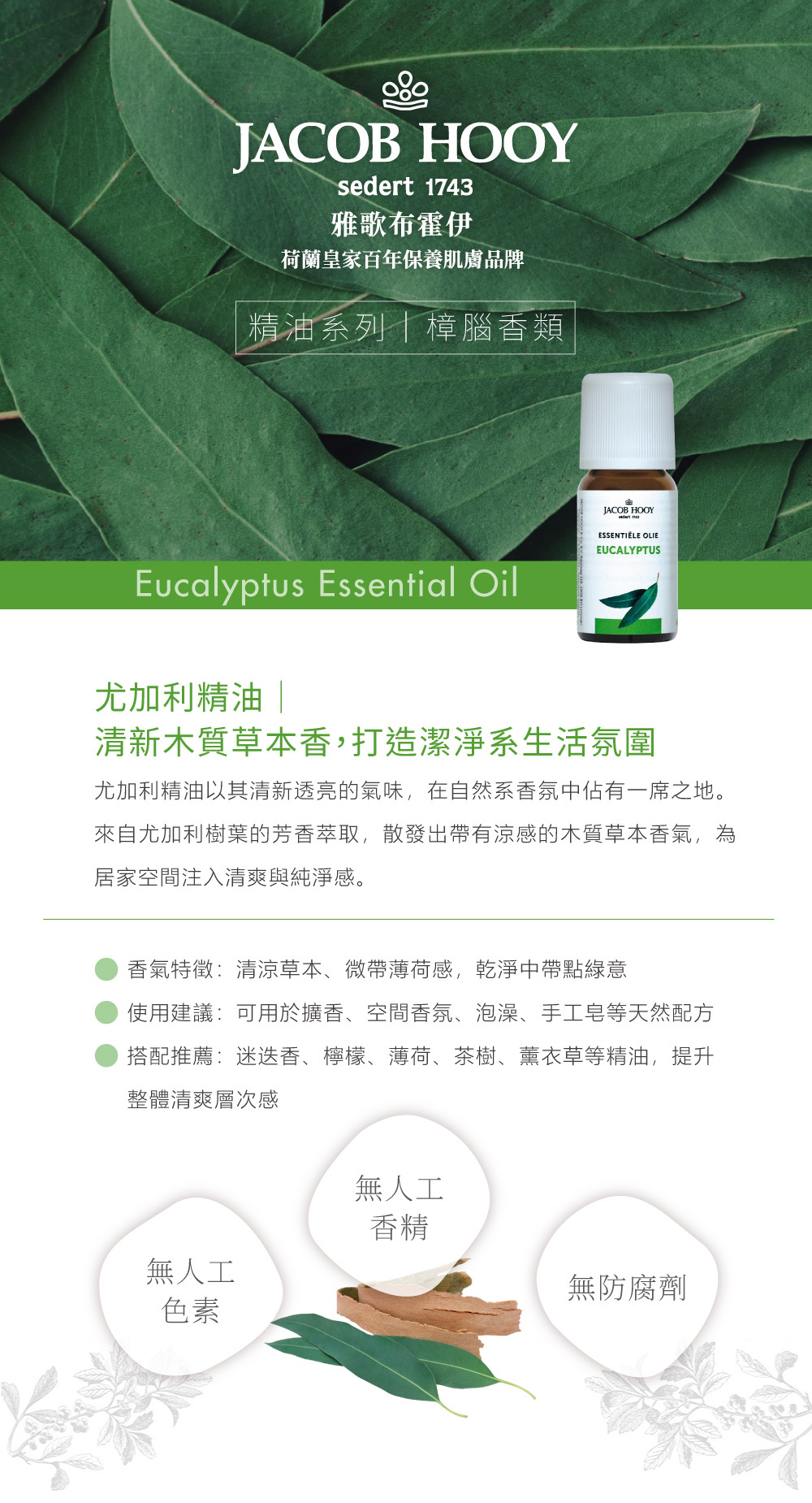 尤加利精油, 清新木質草香香,微帶薄荷感, 乾淨的味道中帶點綠意, 涼爽的香味可以快速消除疲勞感,提神醒腦、提昇注意力。