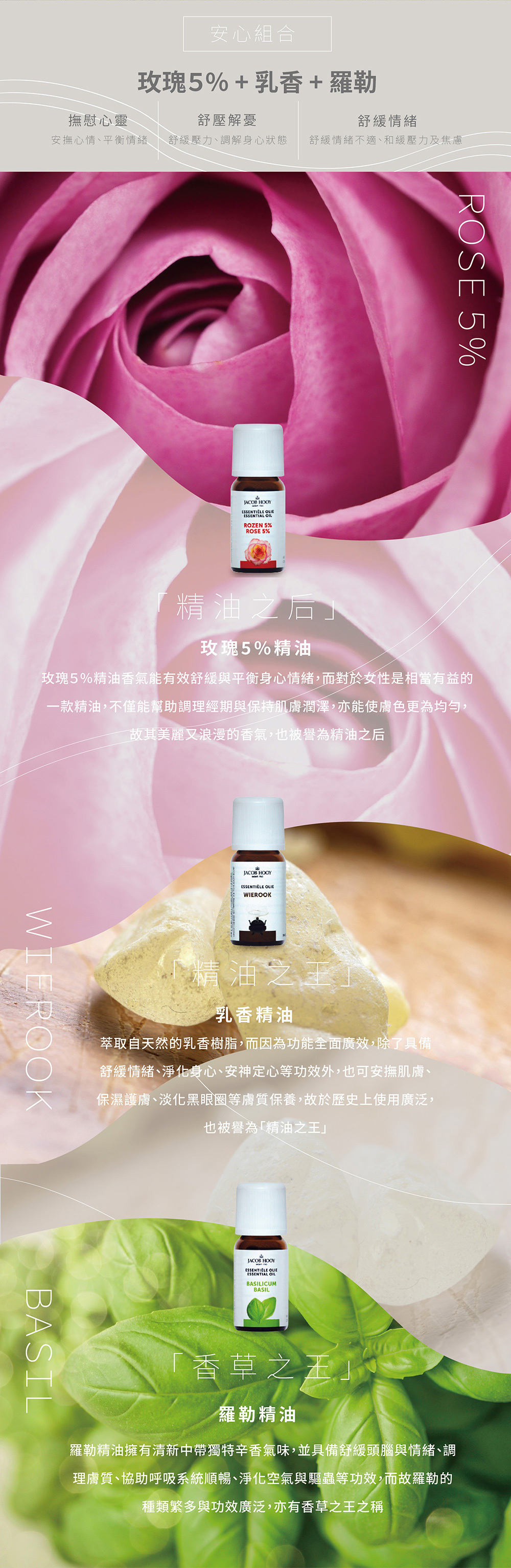 玫瑰5%精油香氣能有效舒緩與平衡身心情緒,而對於女性是相當有益的一款精油,不僅能幫助調理經期與保持肌膚潤澤,亦能使膚色更為均勻,故其美麗又浪漫的香氣,也被譽為精油之后