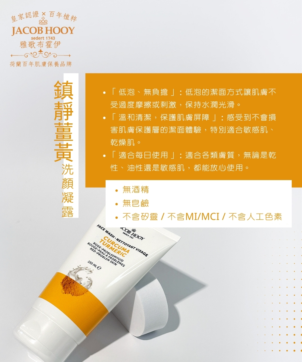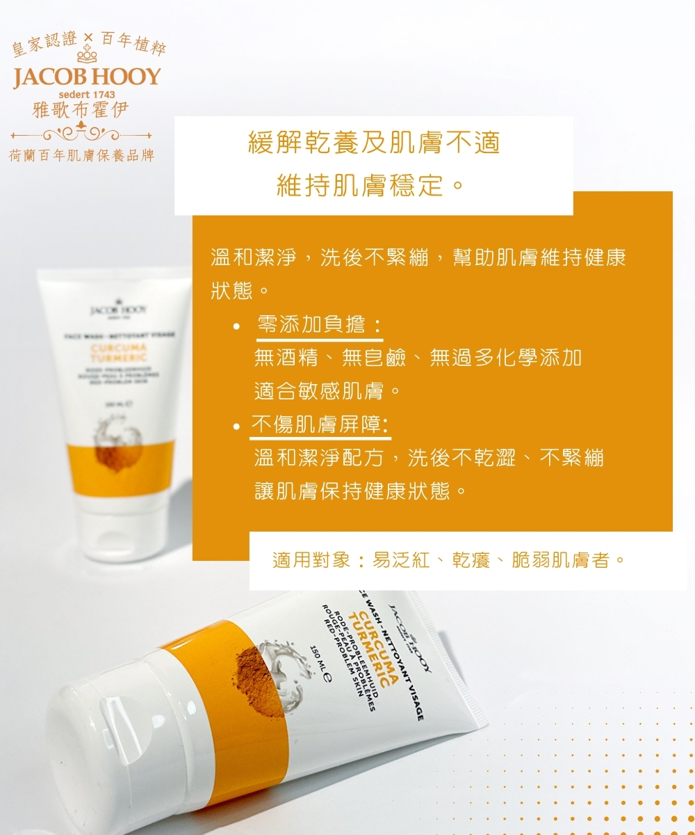 富含薑黃根與洋甘菊精華,舒緩乾燥、降低刺激。