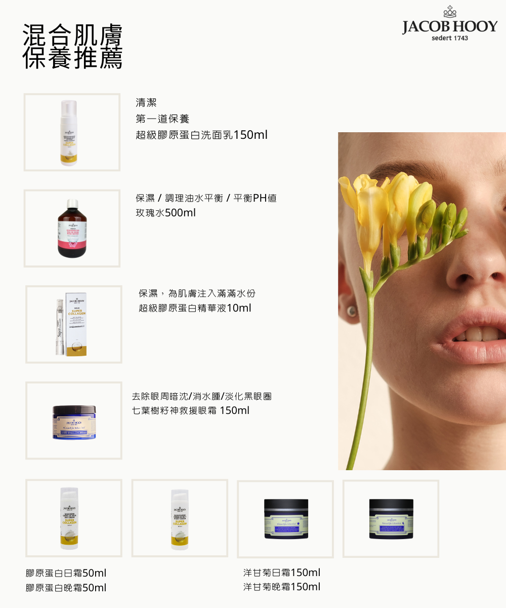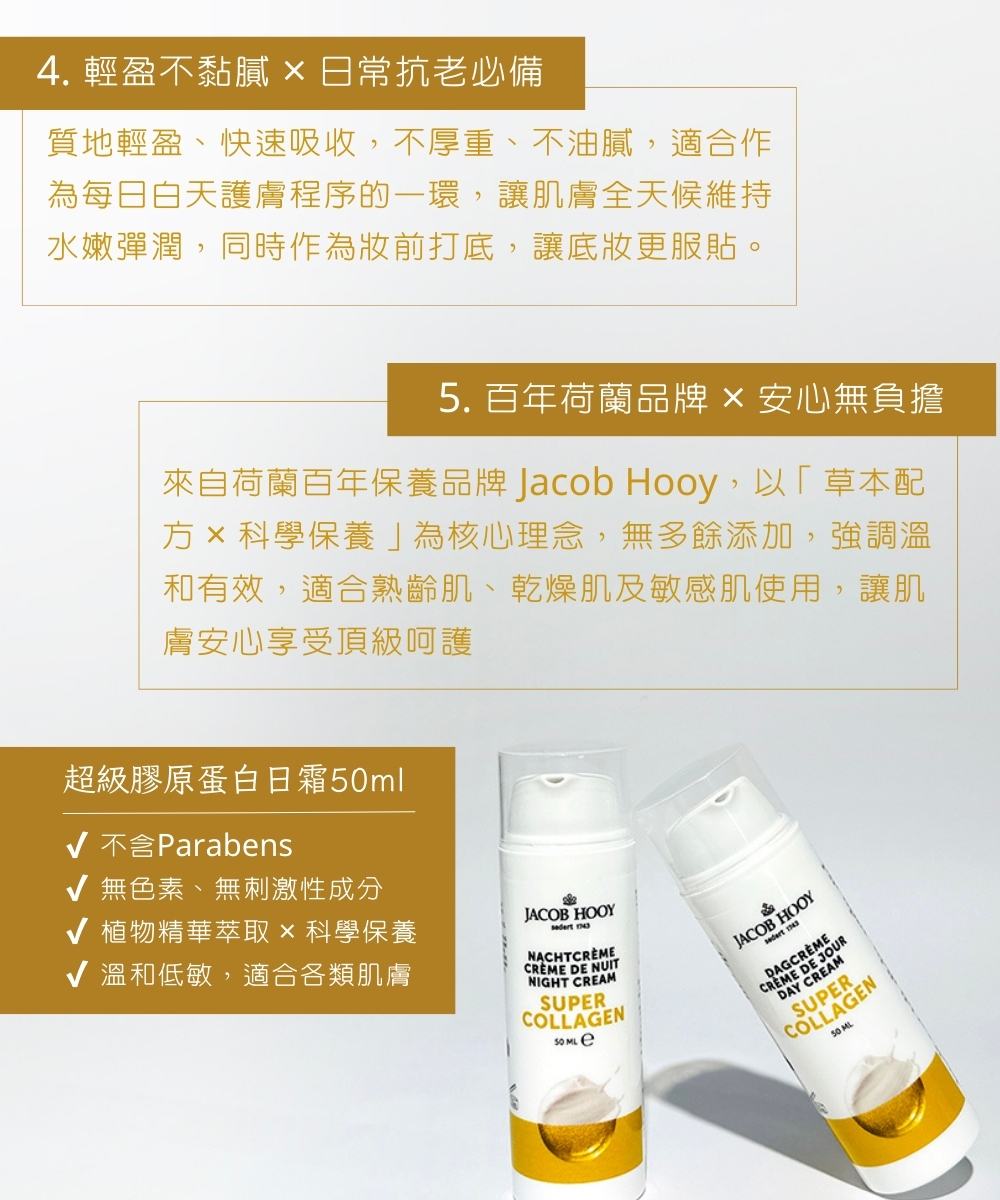 Jacob Hooy 超級膠原蛋白日霜,結合蘆薈、水解膠原蛋白、乳木果油與維他命E,質地輕盈不黏膩,保濕同時能修護肌膚屏障,適合早上保養使用。
