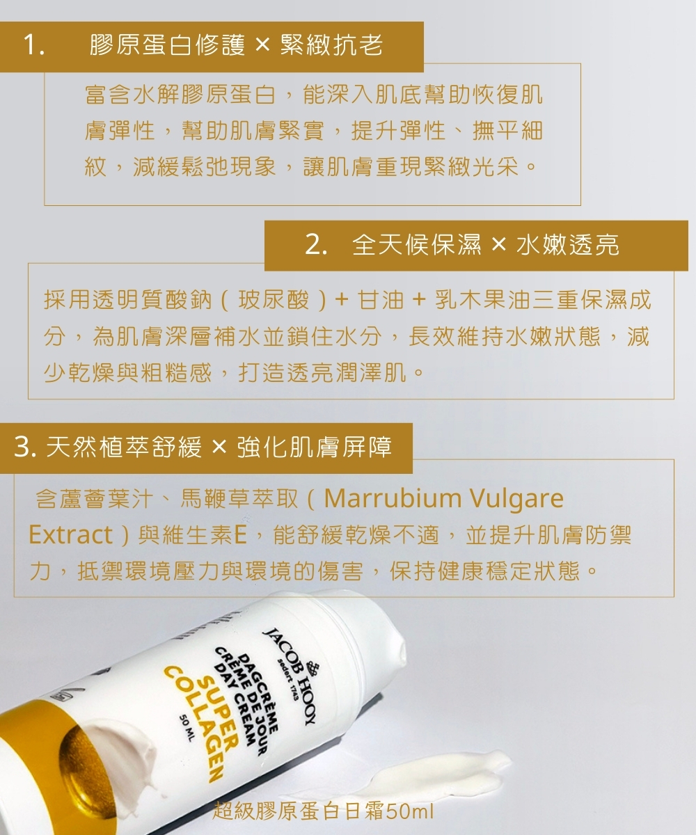 Jacob Hooy 超級膠原蛋白日霜,結合蘆薈、水解膠原蛋白、乳木果油與維他命E,質地輕盈不黏膩,保濕同時能修護肌膚屏障,適合早上保養使用。
