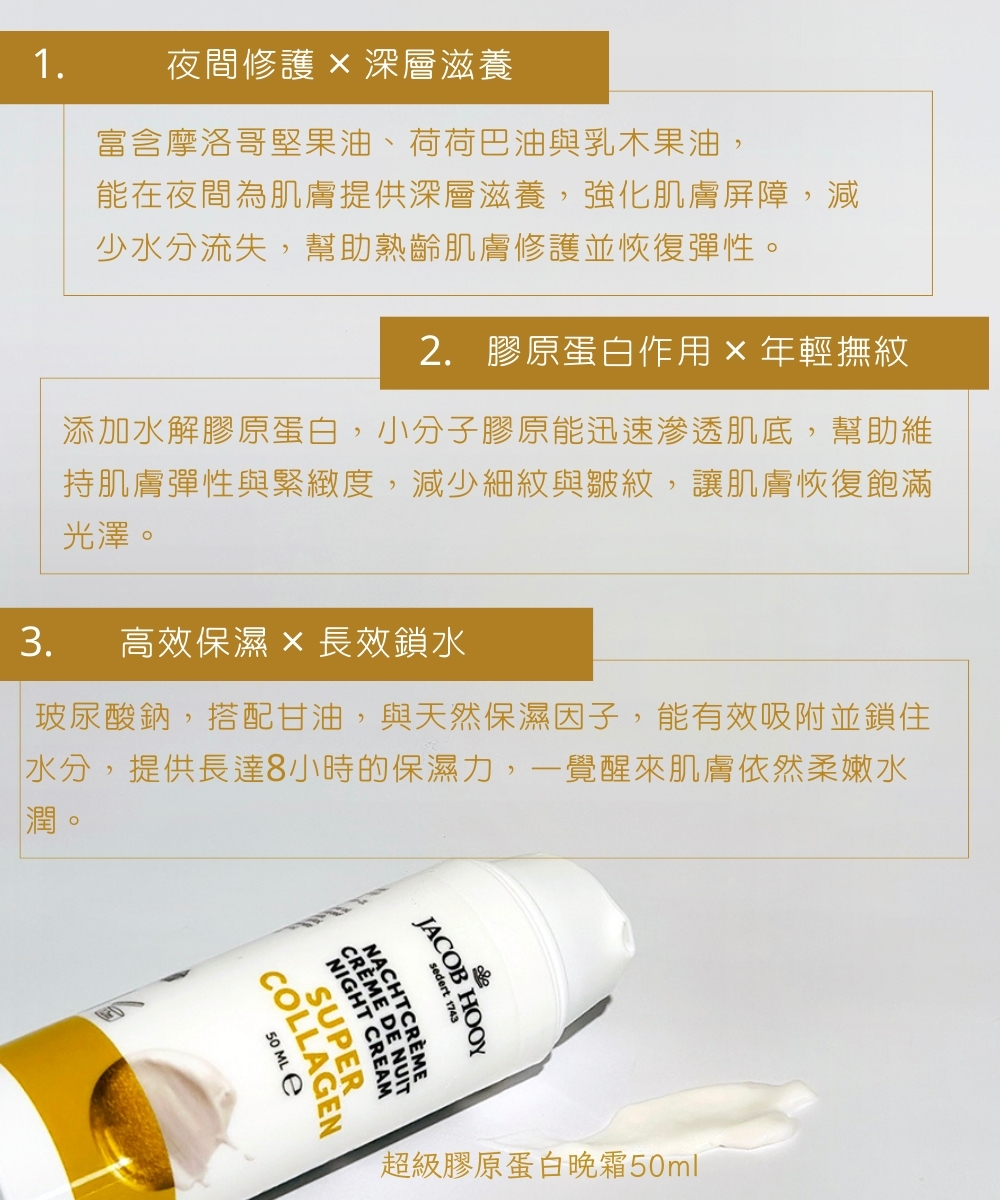 Jacob Hooy 超級膠原蛋白晚霜,含有來自海洋的膠原蛋白胜肽與雙重玻尿酸,結合AQUAXYL、神經醯胺等保濕修護成分,幫助提升肌膚含水量與彈力。