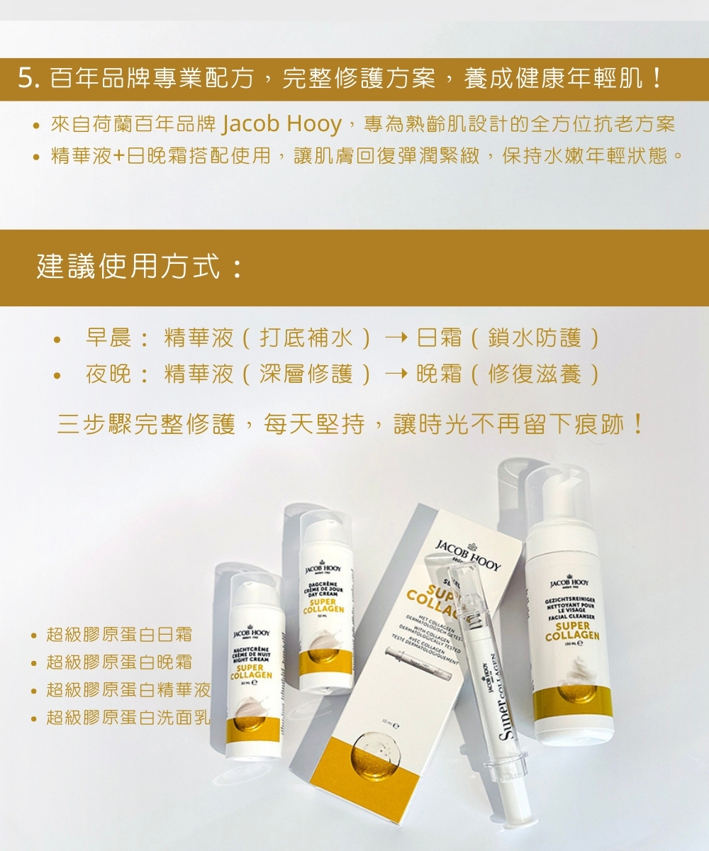 來自荷蘭百年品牌 Jacob Hooy,超級膠原蛋白系列以天然純淨為核心,選用國際知名 Peptan 海洋膠原蛋白,搭配雙重玻尿酸、天然保濕因子與蘆薈萃取,打造一系列適合各種膚質、特別是敏感肌也能安心使用的保養品。