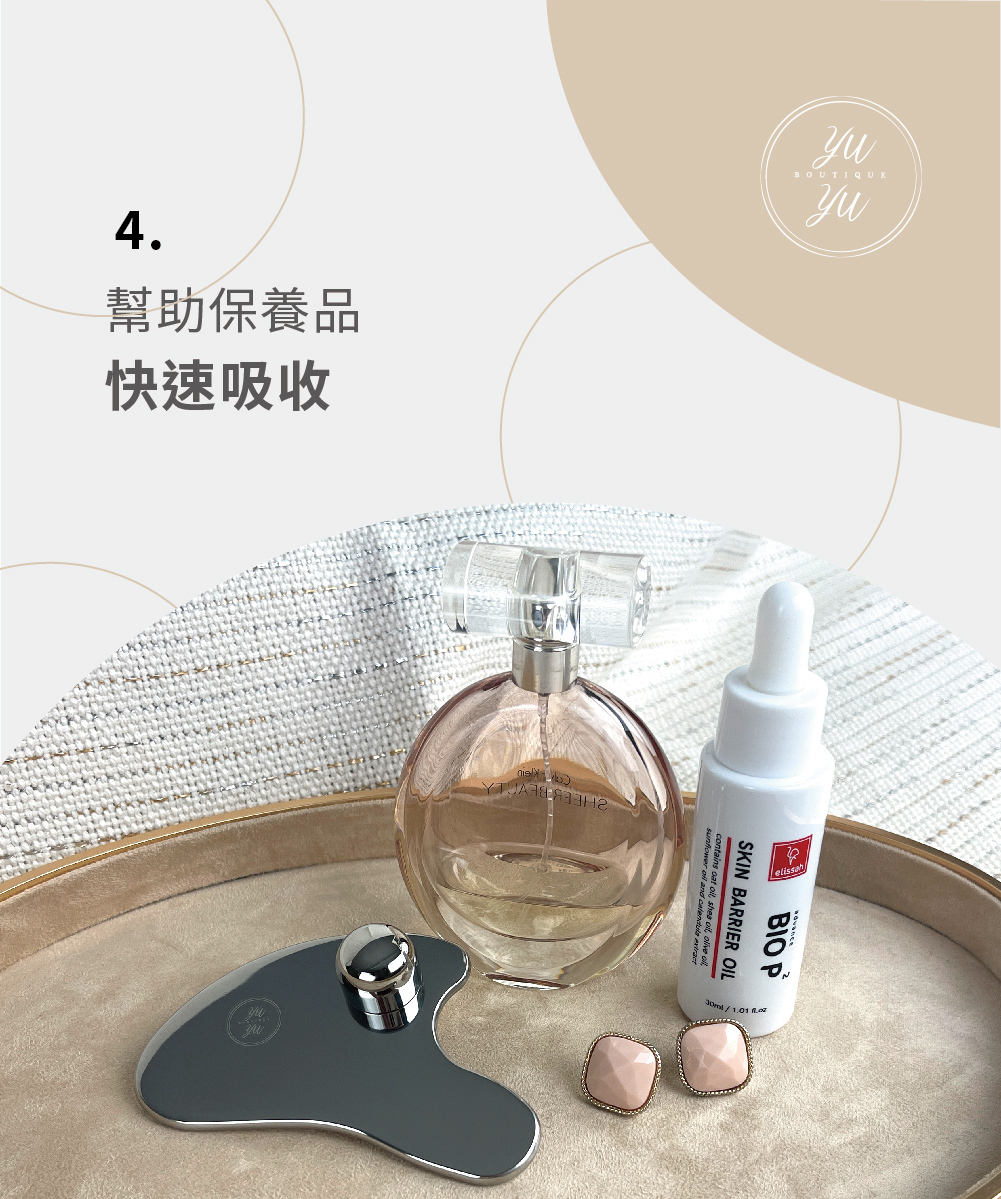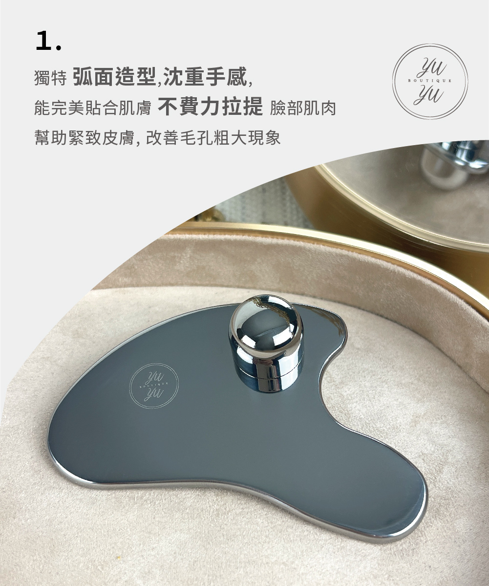 1. 獨特弧面造型,沈重手感, 能完美貼合肌膚, 不費力拉提臉部肌肉, 幫助緊致皮膚, 改善毛孔粗大現象