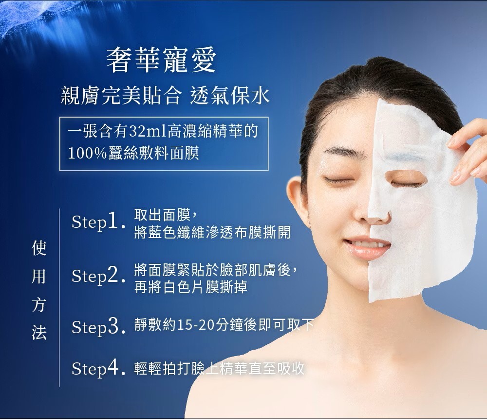頂級蠶絲敷料設計,高濃度專利精華配方,喚起修復機能,有效延緩肌膚老化、淡化瑕疵、透亮膚色,長效保濕與滋養,肌膚有感緊緻、提拉抗齡。