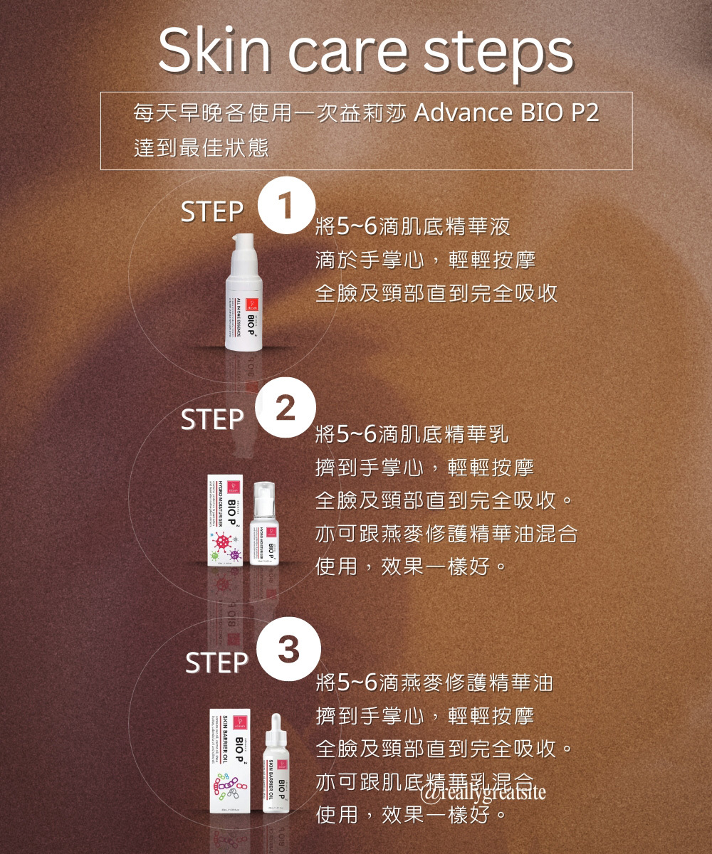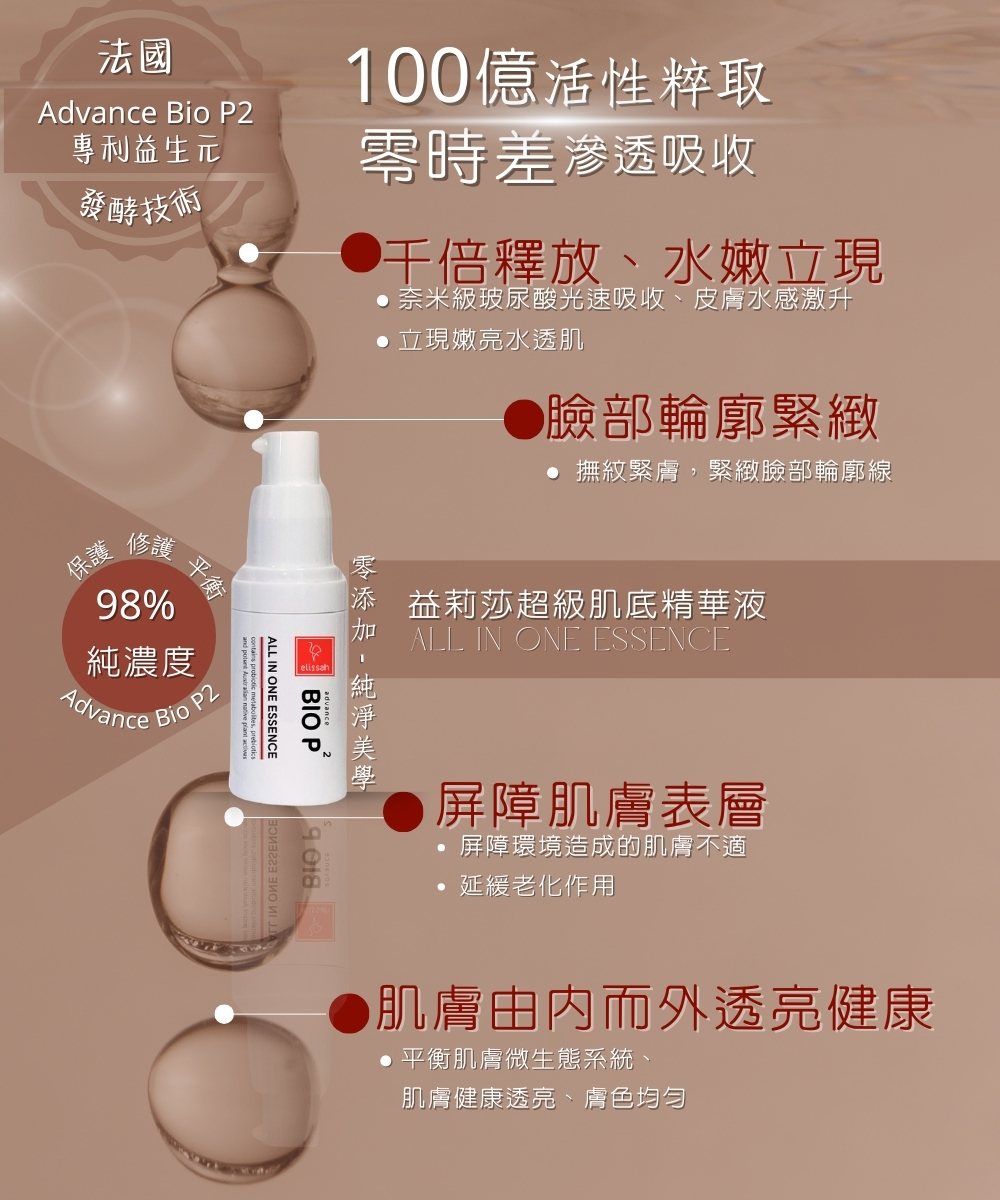專利Advance BIO P2科技,融合益生菌+益生元+後生元,建立肌膚微生態平衡,提升屏障防護,舒緩不適、均勻膚色。