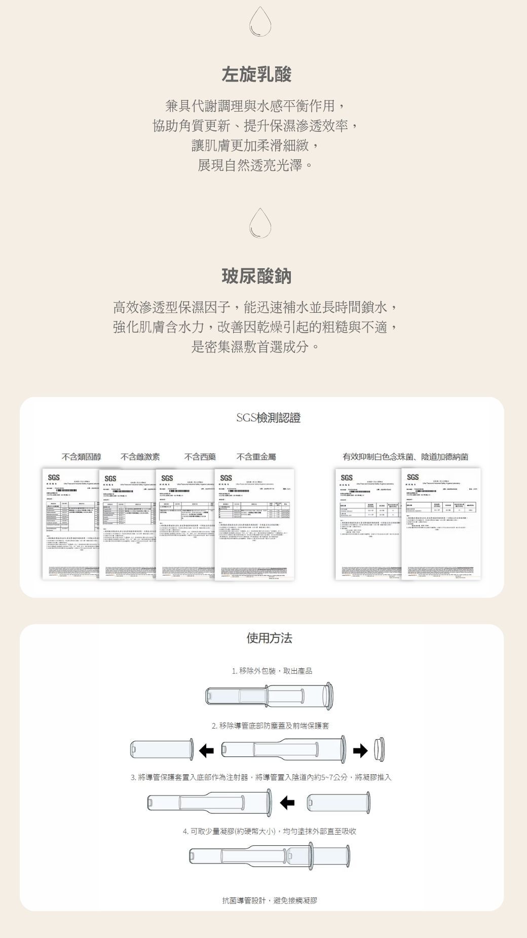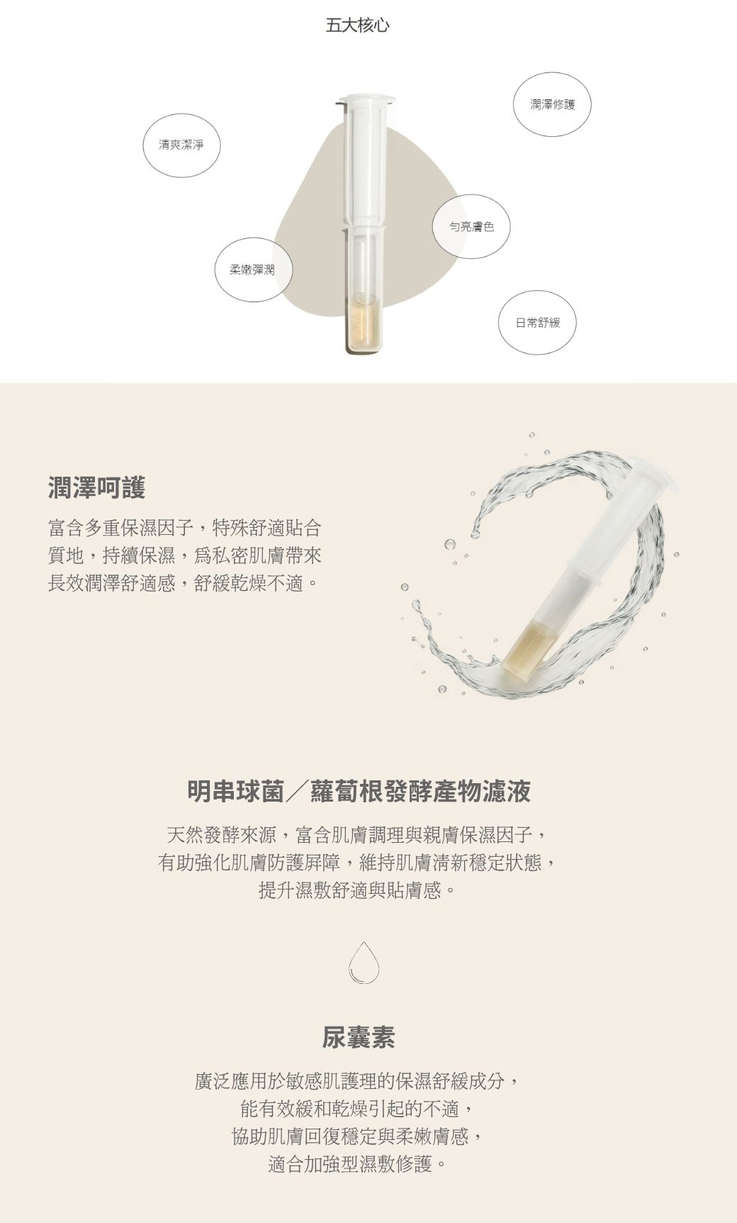 潤澤修護:富含多重保濕因子,特殊舒適貼合質地,持續保濕,為私密肌膚帶來長效潤澤舒適感,舒緩乾燥不適。