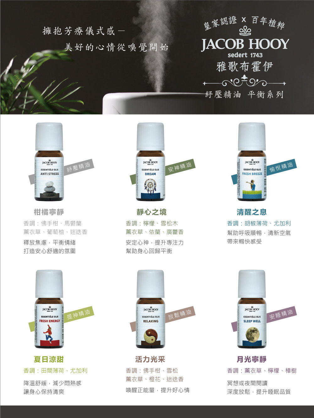 JACOB HOOY全新紓壓精油,透過大自然的芳香能量,溫柔地療癒身心靈,帶來放鬆、平衡與活力。它能舒緩壓力、提升專注力,幫助身體恢復活力,同時淨化負能量,帶來內在的和諧與安定。
