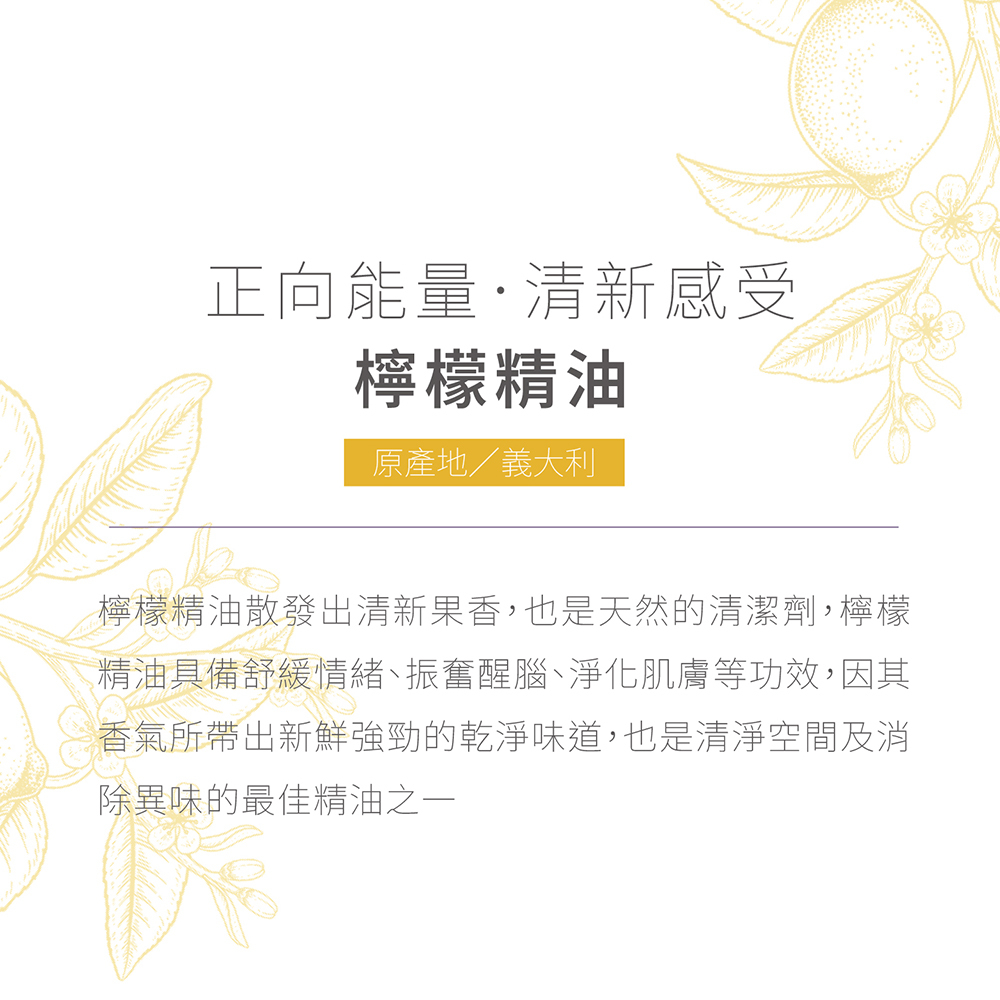 檸檬精油明亮清爽的柑橘香氣,彷彿一早打開窗戶,陽光灑落的清晨的陽光,輕輕喚醒你的心。